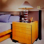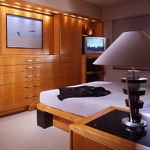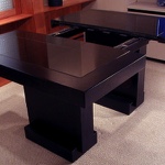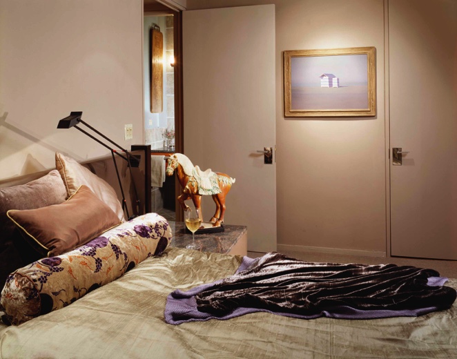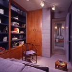 This minimalist home has been designed to compliment the client's art collection. The dining area has an expandable custom-designed table, generously seating 4 to 6 people. A back-lit etched-glass panel is surrounded by an elaborate encasement. The custom-designed bedroom houses the client's luxurious collection of clothing. The den office and guest room are small to meet the client's needs. The bathroom has a rugged design with a concealed door that usually remains in an open position.