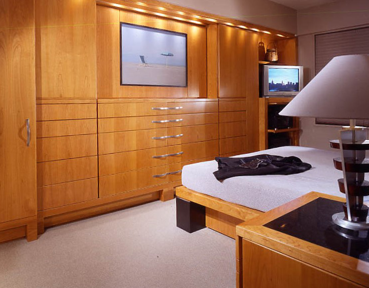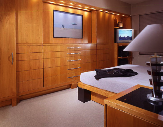 This minimalist home has been designed to compliment the client's art collection. The dining area has an expandable custom-designed table, generously seating 4 to 6 people. A back-lit etched-glass panel is surrounded by an elaborate encasement. The custom-designed bedroom houses the client's luxurious collection of clothing. The den office and guest room are small to meet the client's needs. The bathroom has a rugged design with a concealed door that usually remains in an open position.