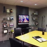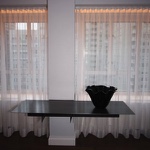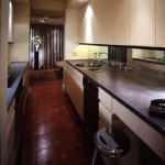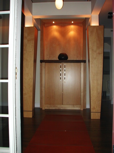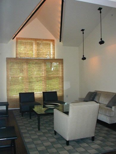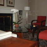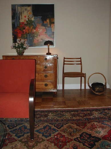 Gracious room with 1920s-style sofas, Wiener Workstatte pull-up chairs, alabaster chandalier, and custom hand-knotted rug to compliment the style of that time.