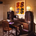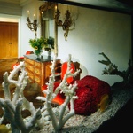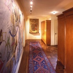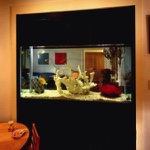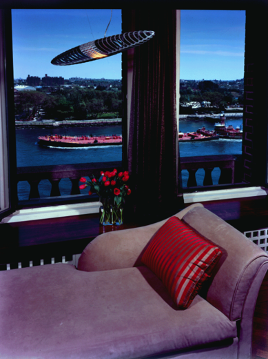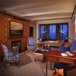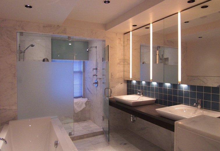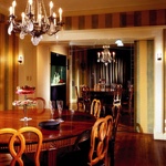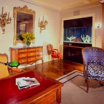 This prewar apartment has been designed to enhance an inherited collection of fine period French antiques. The entry doubles as a library for books and magazines hidden behind custom cabinetry armoires, and the floor has a long Persian runner set parallel to the large modern painting. The living room faces the East River and has spectacular views. The living room aquarium is in a wall adjacent to the kitchen and can be viewed from both sides. The living room fireplace is imbedded into the wood paneling and a hand-knotted rug covers the floor. In the dining room, the sliding mirrored wall reflects the space and movement when lit by the rock crystal chandelier.