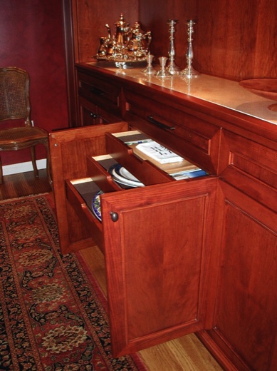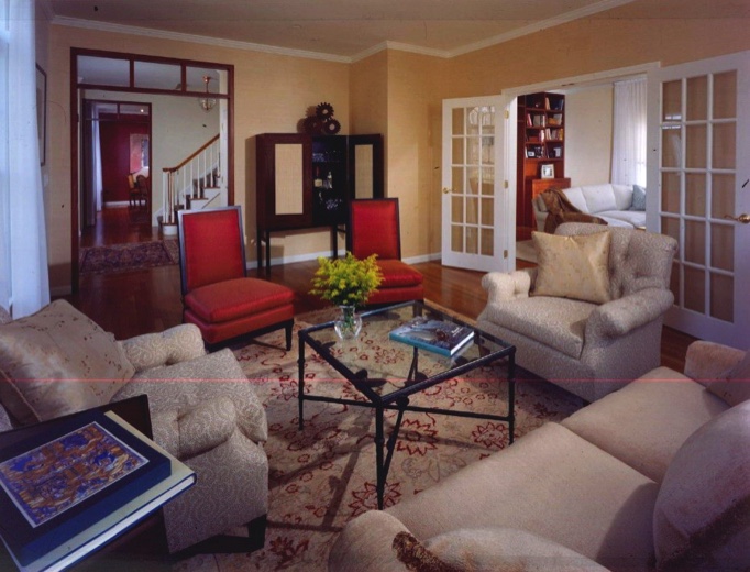 A standard builders' colonial home has been designed in a transitional style. As seen from the kitchen, the family room, which is exposed to the living room, is a place for relaxation. The center hall arches have been enlarged and detailed with cherry trimming. The living room is a formal entertainment space with a contemporary Egyptian rug, traditional upholstered furniture, and a bronze coffee table. The formal dining room walls are painted a deep oxblood red, an alabaster chandelier hangs from the ceiling, chairs surround an antique French-style table, and the Trabiz 1930s rug compliments the custom credenza and furnishings. The painting on the wall is by Nico Paladini.