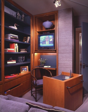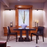 This minimalist home has been designed to compliment the client's art collection. The dining area has an expandable custom-designed table, generously seating 4 to 6 people. A back-lit etched-glass panel is surrounded by an elaborate encasement. The custom-designed bedroom houses the client's luxurious collection of clothing. The den office and guest room are small to meet the client's needs. The bathroom has a rugged design with a concealed door that usually remains in an open position.