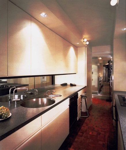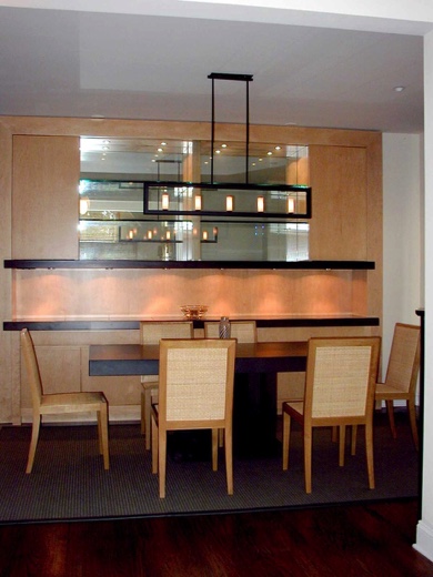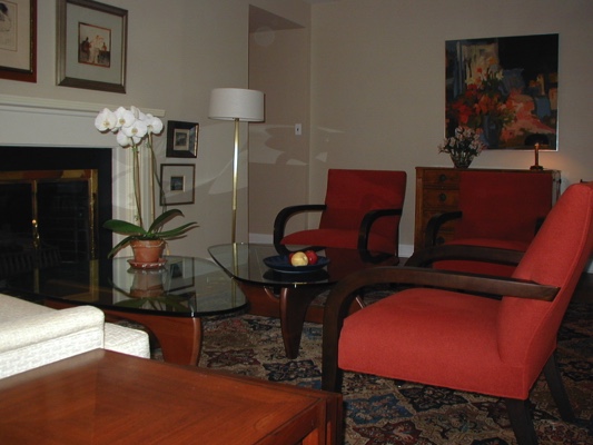 Gracious room with 1920s-style sofas, Wiener Workstatte pull-up chairs, alabaster chandalier, and custom hand-knotted rug to compliment the style of that time.