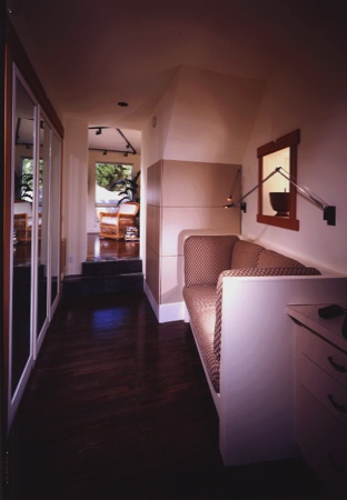 My client decided he wanted his bedroom to be level with his pool in a space below the main part of the house. Some excavation was necessary in order to build the study, the dressing room, the bedroom, and a new bathroom enclosed by levered panels. The open design created an airy summer bedroom and a great place for privacy.