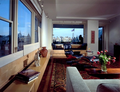 Upon entry to this apartment, you are immediately drawn to the Central Park view, as seen through the windows of the study beyond. The original layout of this 1950s-building apartment was typical of the period, but has been reconfigured to create an open space. Full-height figured maple wood paneling and doors conceal all of the closets and rooms. The large living/dining room, with many north and east windows, is a light airy space. It is furnished with a blend of contemporary art and antiques collected by the client during numerous travels abroad. The Sultanabad living room rug adds colors to an otherwise neutral space and is a favorite hangout spot for the dog.