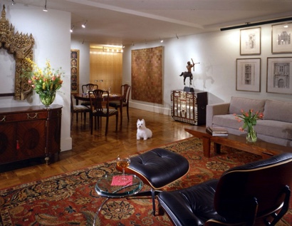 Upon entry to this apartment, you are immediately drawn to the Central Park view, as seen through the windows of the study beyond. The original layout of this 1950s-building apartment was typical of the period, but has been reconfigured to create an open space. Full-height figured maple wood paneling and doors conceal all of the closets and rooms. The large living/dining room, with many north and east windows, is a light airy space. It is furnished with a blend of contemporary art and antiques collected by the client during numerous travels abroad. The Sultanabad living room rug adds colors to an otherwise neutral space and is a favorite hangout spot for the dog.