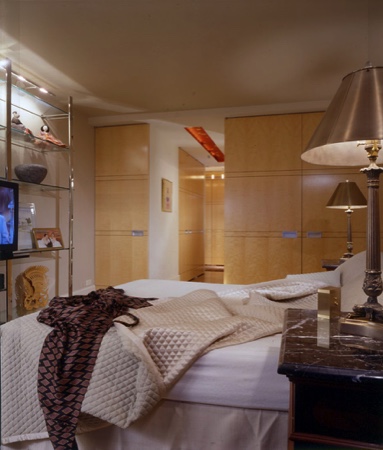 Upon entry to this apartment, you are immediately drawn to the Central Park view, as seen through the windows of the study beyond. The original layout of this 1950s-building apartment was typical of the period, but has been reconfigured to create an open space. Full-height figured maple wood paneling and doors conceal all of the closets and rooms. The large living/dining room, with many north and east windows, is a light airy space. It is furnished with a blend of contemporary art and antiques collected by the client during numerous travels abroad. The Sultanabad living room rug adds colors to an otherwise neutral space and is a favorite hangout spot for the dog.