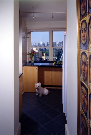 Upon entry to this apartment, you are immediately drawn to the Central Park view, as seen through the windows of the study beyond. The original layout of this 1950s-building apartment was typical of the period, but has been reconfigured to create an open space. Full-height figured maple wood paneling and doors conceal all of the closets and rooms. The large living/dining room, with many north and east windows, is a light airy space. It is furnished with a blend of contemporary art and antiques collected by the client during numerous travels abroad. The Sultanabad living room rug adds colors to an otherwise neutral space and is a favorite hangout spot for the dog.