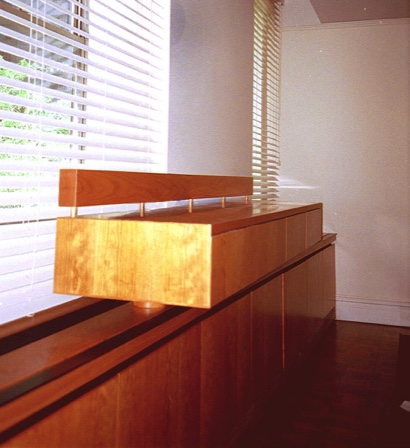 Dining-area custom buffet with drawers cantilevered above convector cover.