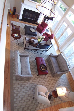 The living room faces the bay and the windows have large translucent sun-screened shades to soften the intense sunlight. The handsome arches along one wall were built to hide the structure and thereby shape an awkward space into a gracious, comfortable living room. The size of the room allowed me to furnish it with two distinct conversation areas. The chandelier was installed over one area, and a large rug ties all the furniture together.