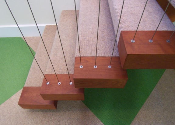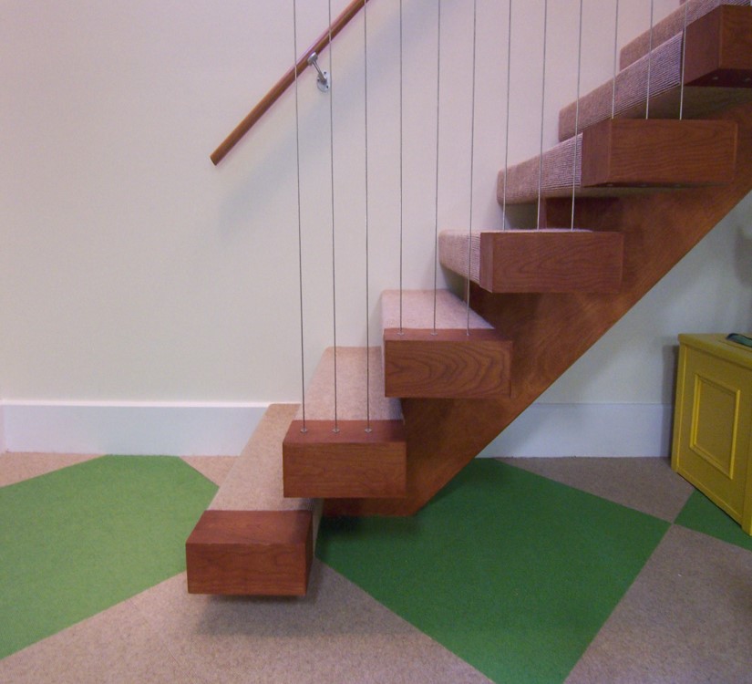 I reconfigured the old kitchen and designed the staircase along with the bedrooms, etc. The kitchen-banquette eating-area cantilevers above the stairs required some child-safety measures. Cable wires were designed into the open space above the kitchen and along one side of the staircase. Colorful carpet tiles were installed in the playroom, cerulean mosaic tiles in the bathroom, and each bedroom had a different motif.