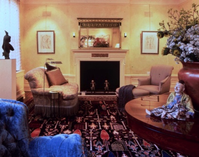 Park Avenue apartments such as this one were designed for gracious living. This large living room is divided by a circular 18th-century American antique table and is furnished with an array of 18th- and 19th-century furniture and accessories. A 16-by-25-foot colorful antique Bakhtiari Persian rug ties the room into one elegant space for formal entertainment. The painted Pompeii red bedroom hallway, with an antique mirror and amusing cartouche details, adds character and elegance to an otherwise boring space. The bedroom is painted with neutral subtle cream color and features an oversized headboard, custom night tables, and an antique Biedermeier desk, a perfect mixture of period and contemporary styles.