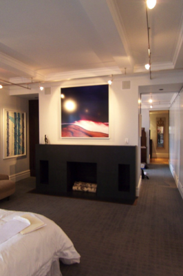 This prewar apartment has been designed to enhance an inherited collection of fine period French antiques. The entry doubles as a library for books and magazines hidden behind custom cabinetry armoires, and the floor has a long Persian runner set parallel to the large modern painting. The living room faces the East River and has spectacular views. The living room aquarium is in a wall adjacent to the kitchen and can be viewed from both sides. The living room fireplace is imbedded into the wood paneling and a hand-knotted rug covers the floor. In the dining room, the sliding mirrored wall reflects the space and movement when lit by the rock crystal chandelier.