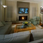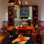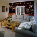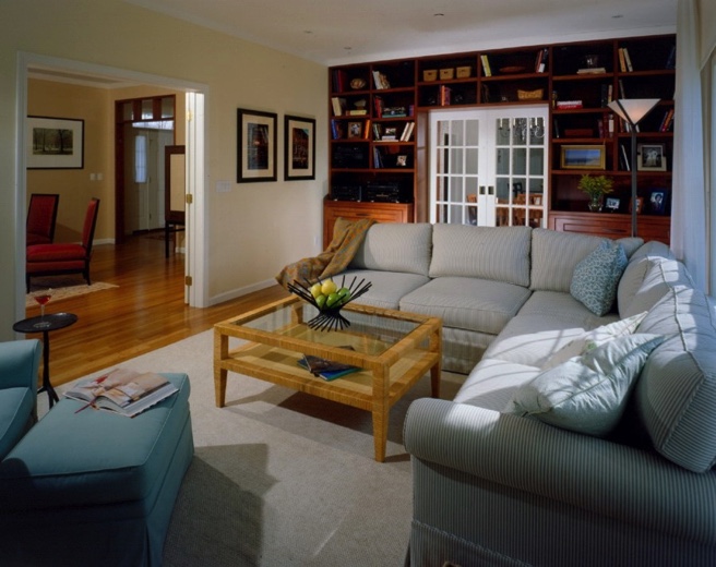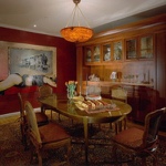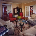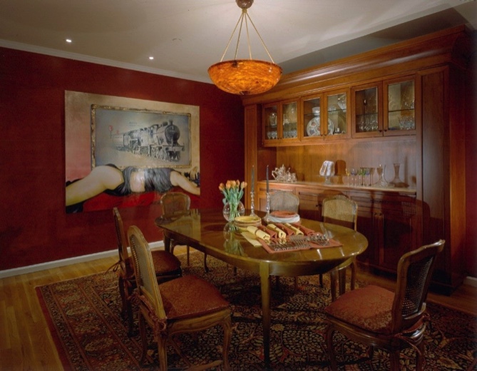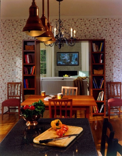 A standard builders' colonial home has been designed in a transitional style. As seen from the kitchen, the family room, which is exposed to the living room, is a place for relaxation. The center hall arches have been enlarged and detailed with cherry trimming. The living room is a formal entertainment space with a contemporary Egyptian rug, traditional upholstered furniture, and a bronze coffee table. The formal dining room walls are painted a deep oxblood red, an alabaster chandelier hangs from the ceiling, chairs surround an antique French-style table, and the Trabiz 1930s rug compliments the custom credenza and furnishings. The painting on the wall is by Nico Paladini.